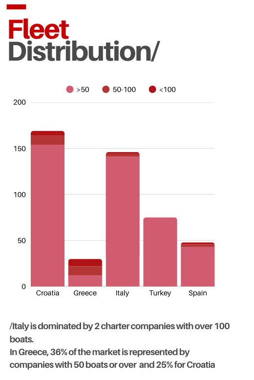 Catamarans remain central to the fleet strategies of most destinations like Croatia, Greece and Turkey. They represent 26% of the global fleet worldwide and they represent 30% of all booked weeks overal. Despite their popularity, especially among families and luxury travelers, catamarans are not proportionally outperforming monohulls. Higher prices and rising marina fees are beginning to cap demand in lower-budget segments.